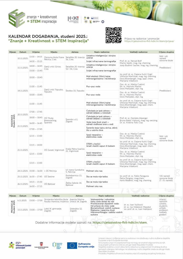 Obavještavamo javnost da je objavljen novi kalendar događanja za studeni, koji obuhvaća planirane promotivne aktivnosti i radionice u okviru projekta „Znanje + Kreativnost = STEM Inspiracija”, sufinanciranog iz Europskog socijalnog fonda plus (ESF+). Program je usmjeren popularizaciji znanosti te razvoju znanstvene pismenosti i kreativnosti kod djece i mladih.